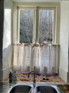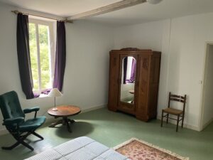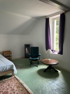 Op de heuvel staat het voormalige wachthuis van het landgoed, het Gardien. De benedenverdieping hiervan is ingericht als vakantiehuis. Boven is een appartement voor een vrijwilliger. Naast een kamer met twee bedden, houtkachel en zitje, is er een aangrenzende kamer met een eettafel en een (tweepersoonsslaap-)bank. De bedden zijn opgemaakt als je komt. Het huis beschikt over een ruime volledig ingerichte keuken met fornuis, oven, koelkast, eettafel en houtkachel. De badkamer heeft een wastafel en douche. Het toilet is apart. Buiten zittend onder de oude pruimenboom, kijk je uit over het glooiende terrein. Vanuit het huis loop je direct het bos in. Ook is het heerlijk wandelen langs de meren op ons eigen landgoed. Geen zin om zelf te koken, dan ben je van harte welkom om mee te eten in het Chateau, wel graag van te voren aangeven. In de schoolvakantieweken verhuren we alleen per week, wisseldag is zaterdag of zondag. We gaan ervan uit dat je het vakantiehuis bij vertrek netjes en schoon achterlaat.